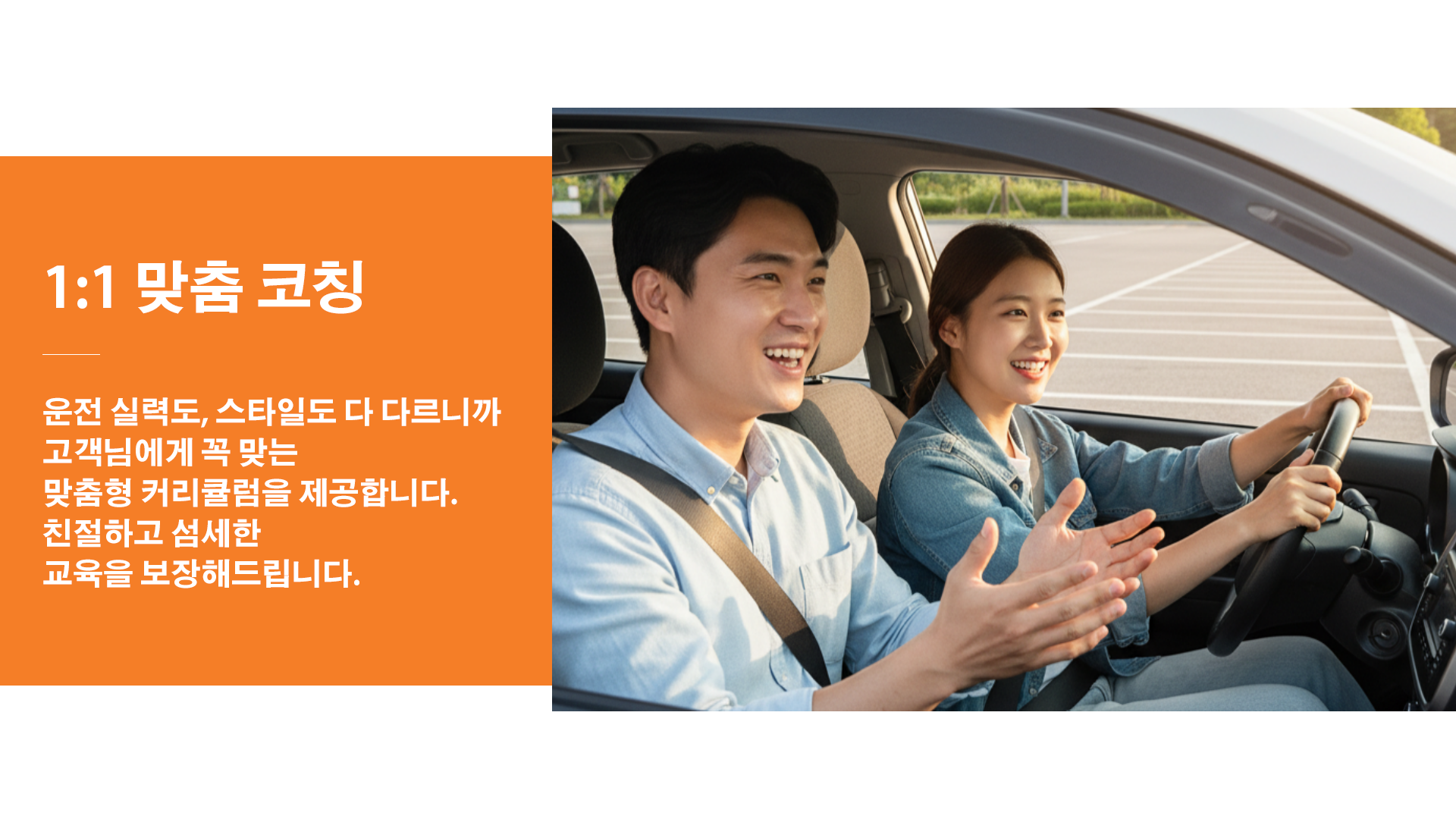 네, 가능합니다. 보조브레이크가 장착된 연수차로 시작하는 것이 기본이며 자차 연수도 가능해요. 자차일 경우 차량 상태와 보험 여부를 확인하면 됩니다.